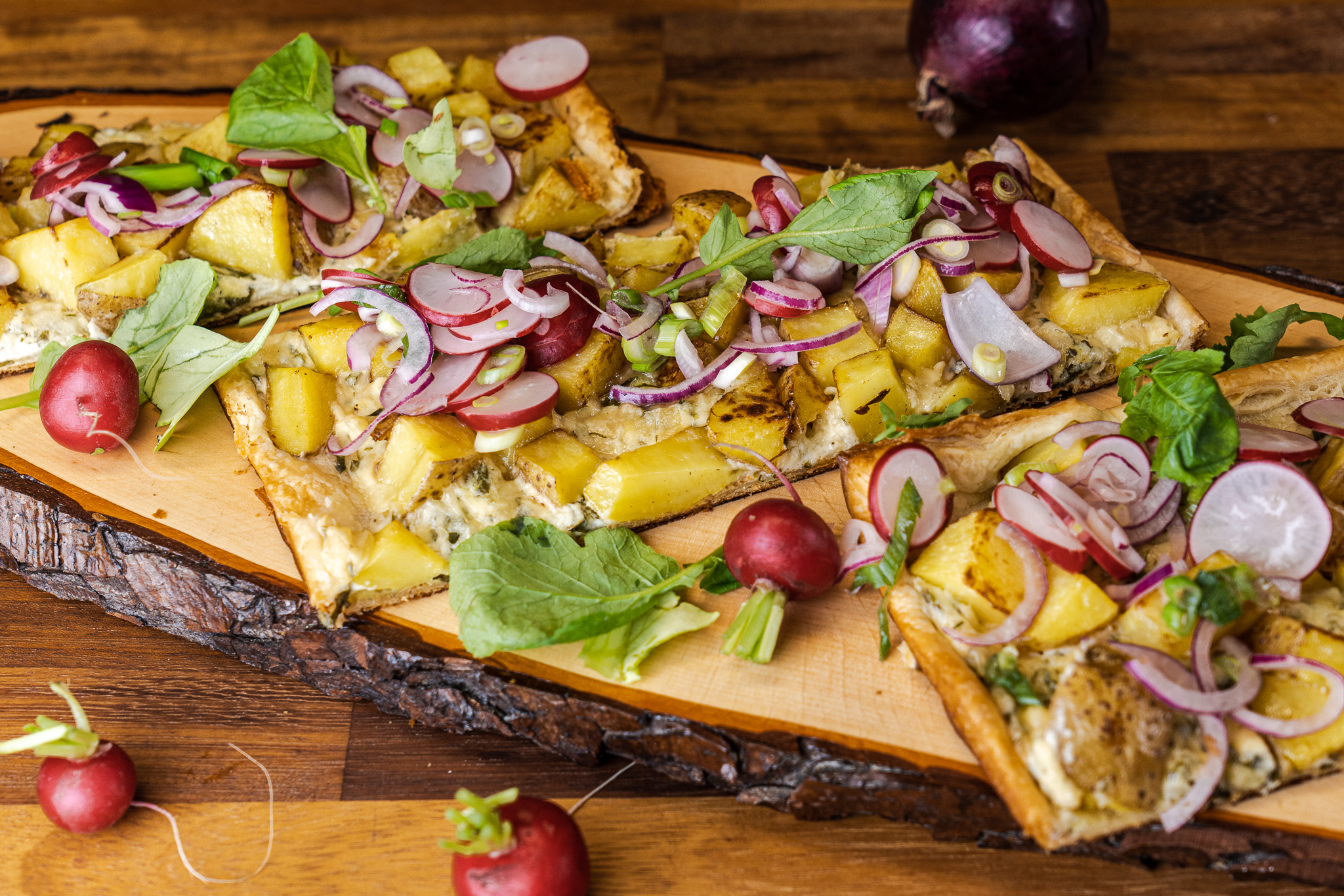 Blätterteig auf einem Backblech ausrollen. Kräuter waschen und fein hacken. Frischkäse, Schnittlauch, Petersilie, 5 EL Olivenöl sowie je 1 Prise Salz und Pfeffer zu einer einheitlichen Creme mixen. Veganen Streukäse unterheben. Kräutercreme auf dem Blätterteig ausstreichen, dabei ringsherum ca. 1 cm Rand lassen. Kartoffeln darauf verteilen und bei 200°C Ober-/Unterhitze für ca. 20 Minuten backen.