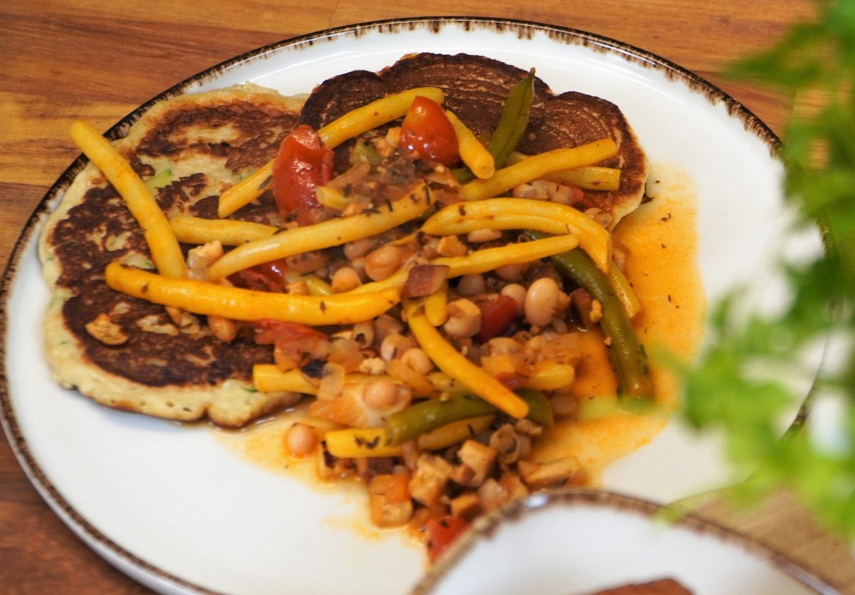 - Bis auf das Öl, alle Zutaten in einer Schüssel mit dem Schneebesen zu einem glatten Teig verrühren. Ca. 10 Minuten ruhen lassen und anschließend ca. 6 gleichgroße Pancakes in Olivenöl ausbacken.