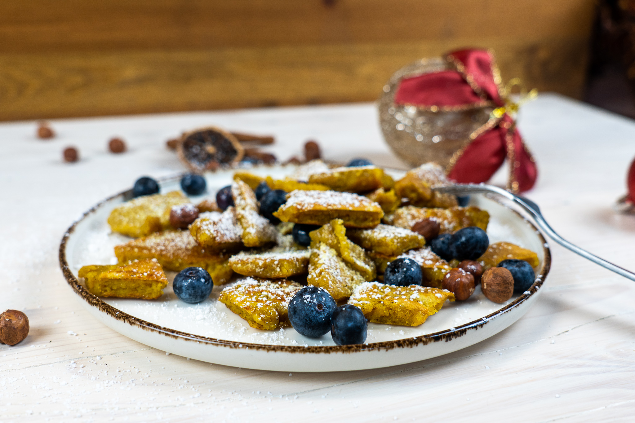 Dinkelschmarrn zusammen mit frischen Blaubeeren, Haselnusskernen und etwas Puderzucker anrichten.