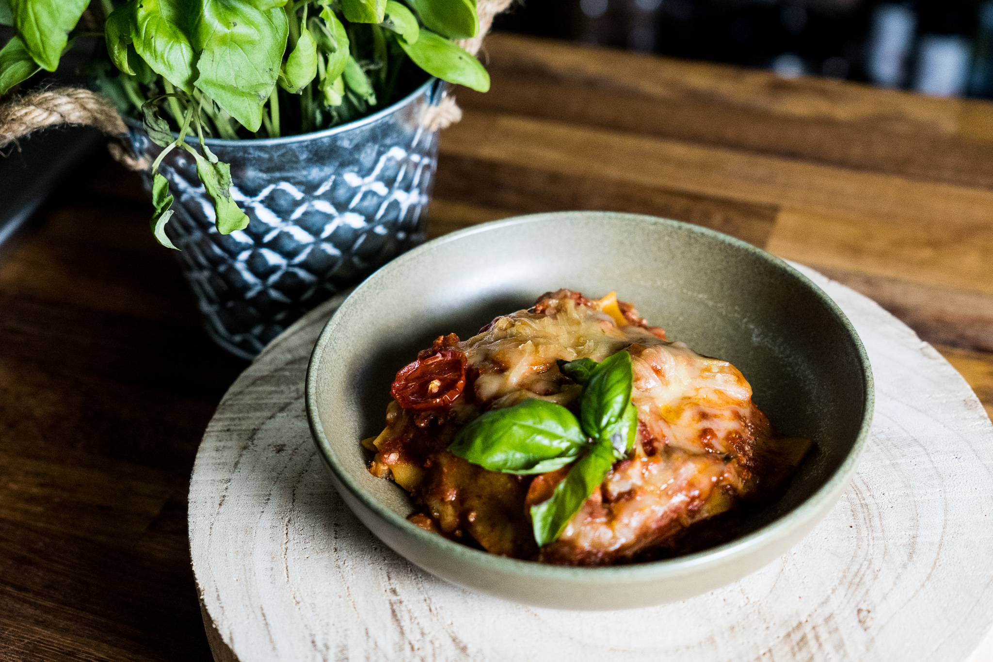 Lasagne auf einem Teller mit einigen frischen Basilikumblättern anrichten. Dazu passt ein Glas Sangiovese von Sontino. Guten Appetit!