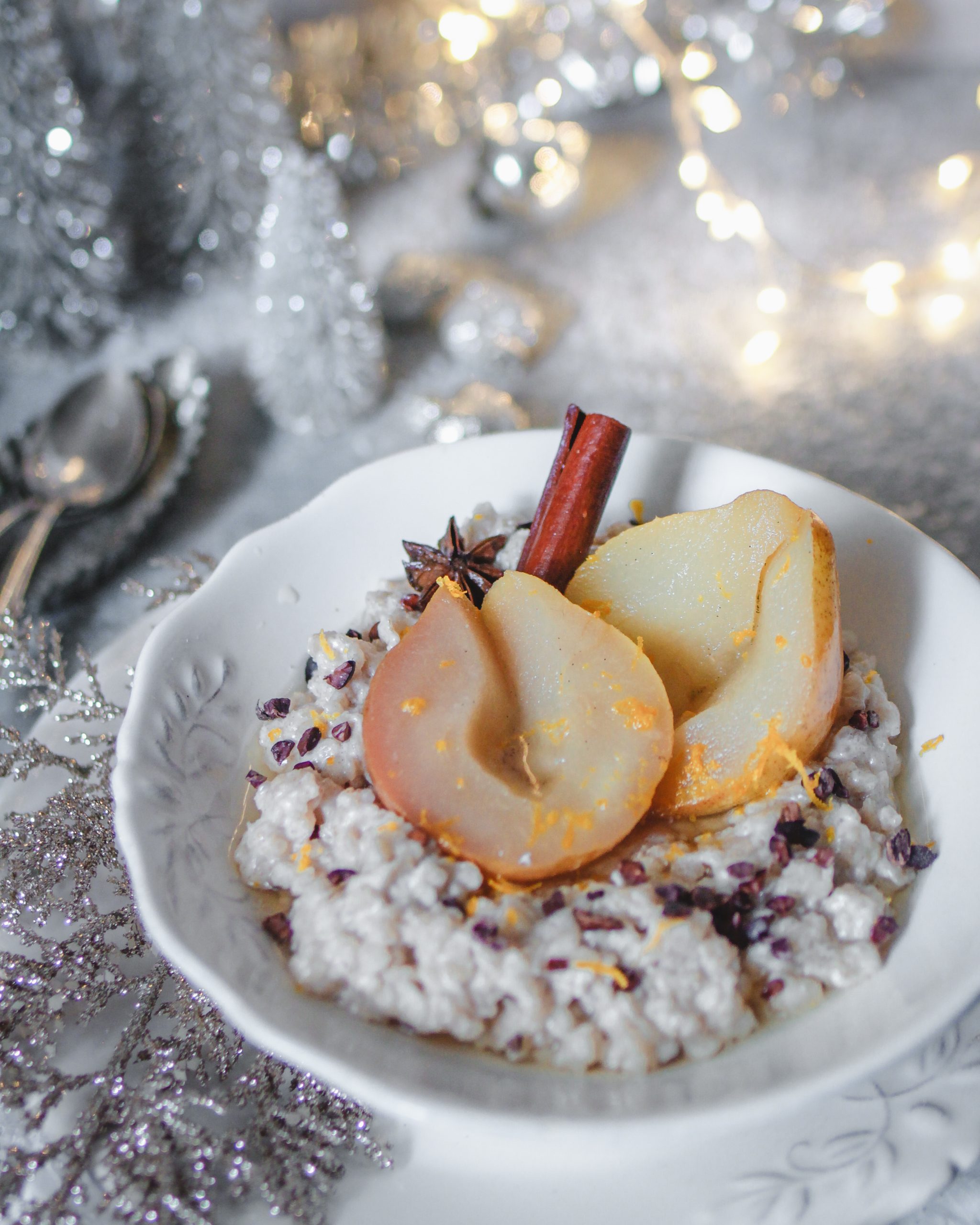 Milchreis und Birnen zusammen anrichten und mit geriebener Orangenschale garnieren.