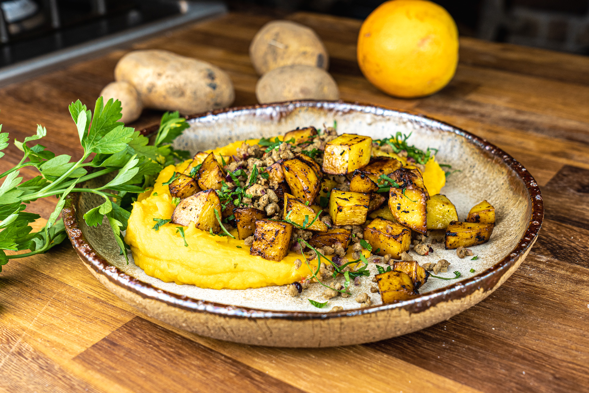 Kartoffeln schälen, gründlich waschen und in ½ cm große Würfel schneiden. Die restlichen Zutaten miteinander glattrühren und damit die Kartoffelwürfel marinieren. Die Kartoffelwürfel auf einem mit Backpapier ausgelegten Backblech geben und im vorgeheizten Backofen bei 220°C Ober- und Unterhitze für ca. 25 Minuten knusprig backen.