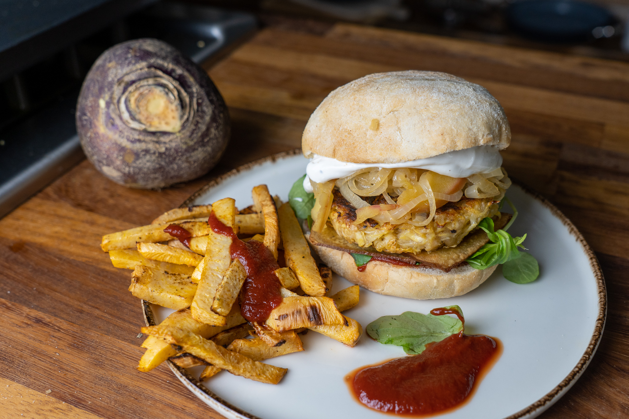 Für die Pommes Frites Steckrübe schälen, in Stifte schneiden und gleichmäßig auf einem mit Backpapier ausgelegten Backblech verteilen. Mit 1 EL Olivenöl, Salz, Pfeffer und Paprikapulver vermengen. Bei 220°C Ober-/Unterhitze in ca. 25-30 Minuten goldgelb backen.