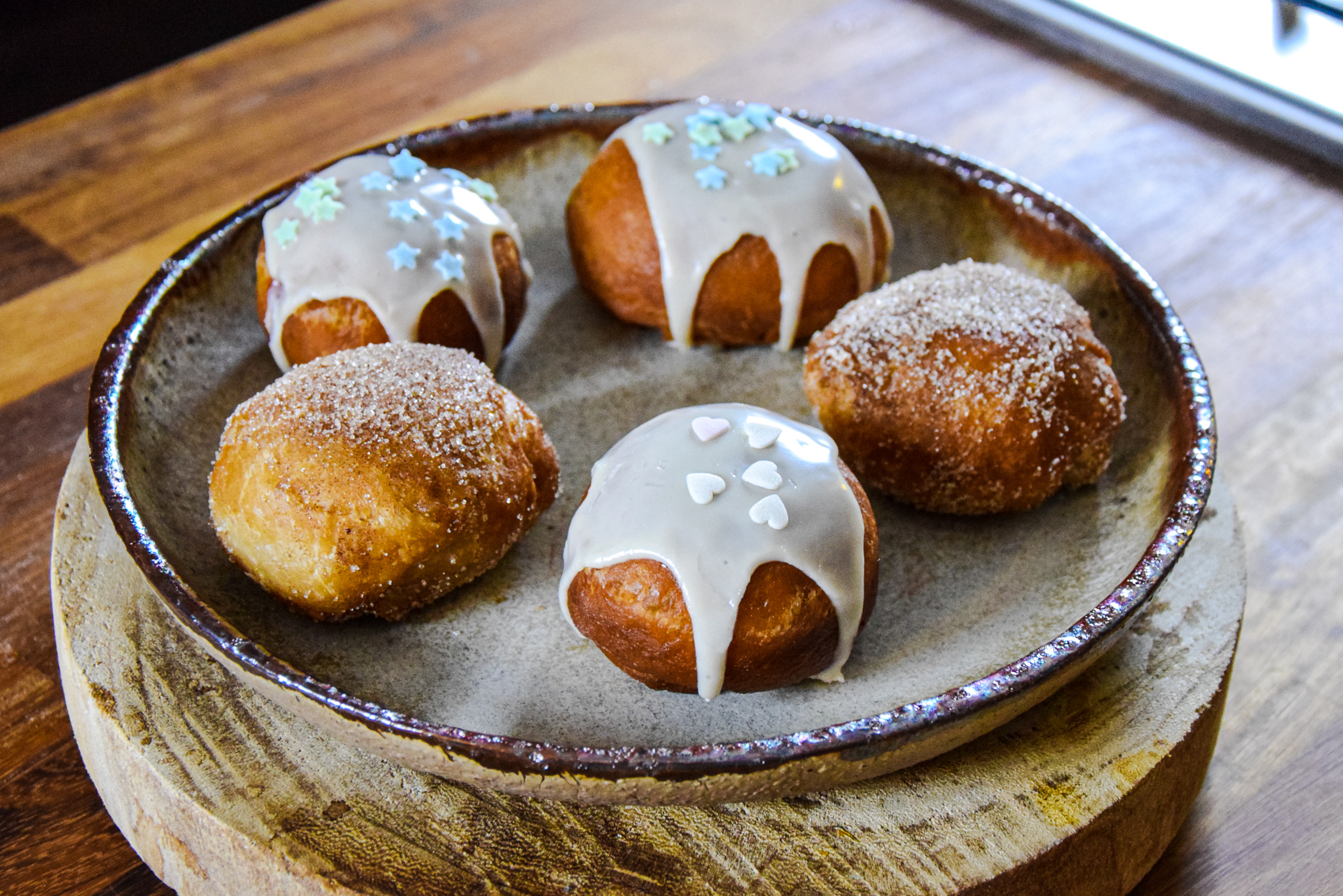 Variante 2: Zucker und Zimt vermengen und die ausgebackenen Berliner darin wälzen.