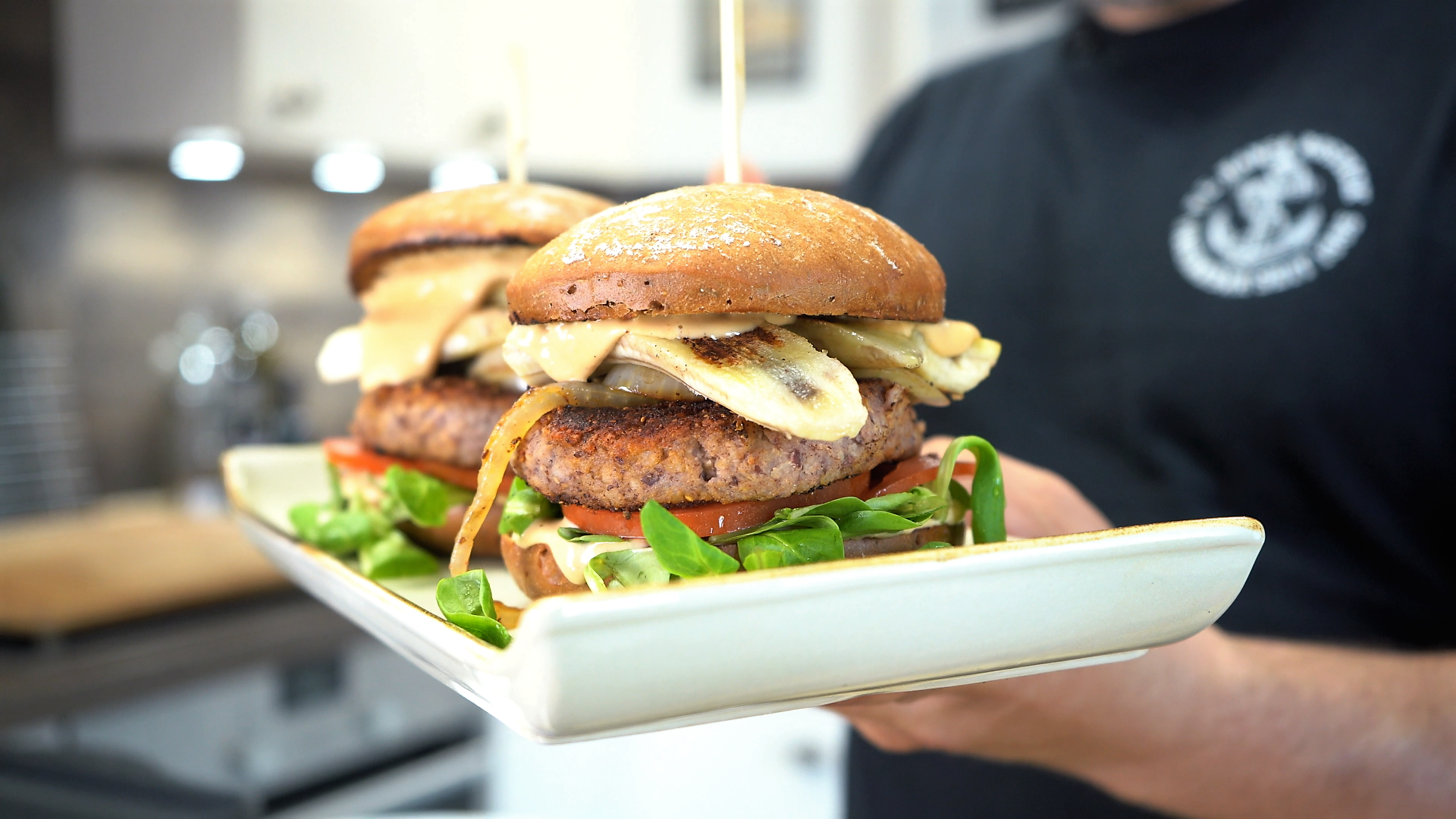 Zwiebel in Scheiben schneiden, Bananen halbieren und beides von beiden Seiten knusprig braten. Brötchen aufschneiden und ohne die Zugabe von Fett in der Pfanne anrösten (nur die Schnittflächen). Tomaten in Scheiben schneiden, auf die Brötchen Soße verstreichen, darauf den Feldsalat geben, Tomate, Patty Banane, Zwiebeln und zum Schluss die obere Brötchenhälfte. Guten Appetit!