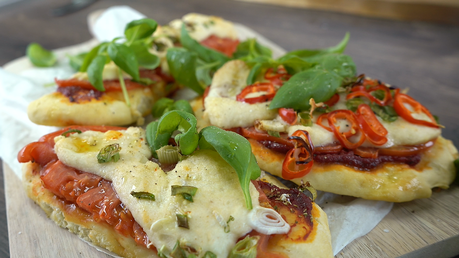 Eine gusseiserne Pizzapfanne oder ein Backblech mit Olivenöl bestreichen. Den Teig in ca. 7 Teile teilen. Diese auf eine Dicke von ca. 2-3 mm ausrollen und auf die Pizzapfanne bzw. ein Blech verteilen. Den Tomtanstreich auf den Teigfladen ausstreichen. Oregano darüberstreuen und mit Tomate sowie Mozzarella bedecken. Frühlingszwiebel, Knoblauch und Chili darüber geben. Mit einigen Tropfen Olivenöl beträufeln und in den vorgeheizten Backofen bei 180°C Umluft für ca. 10-15 Minuten goldbraun backen.