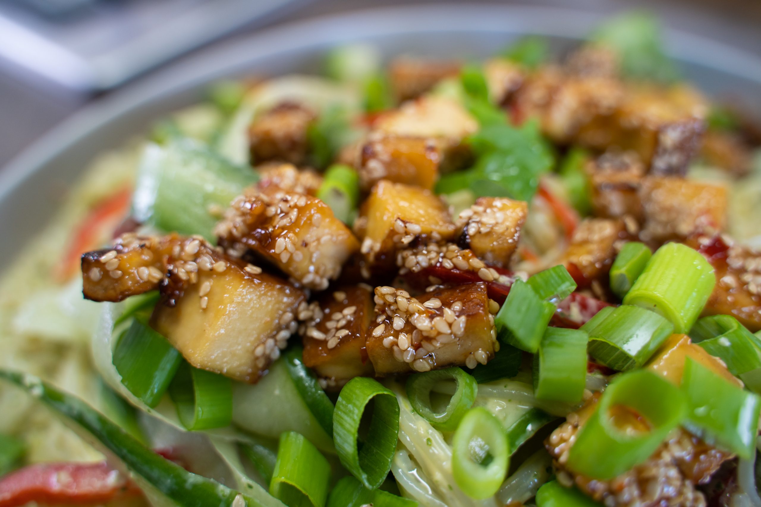 Den Sweet-Chili-Tofu auf dem Reisnudelsalat anrichten. Zum Schluss noch das Grün der Frühlingszwiebeln in feine Ringe schneiden und darauf verteilen. Guten Appetit!
