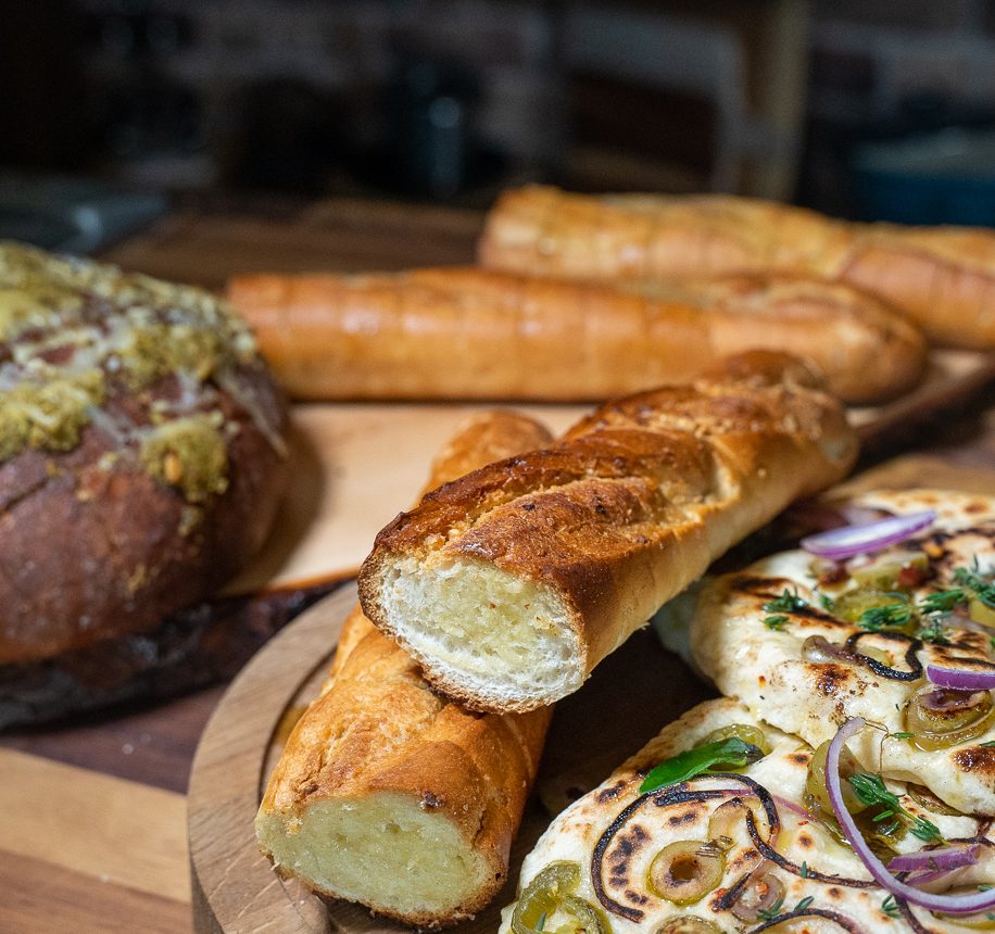 - Knoblauch, Olivenöl und Salz in einem Mörser vermengen. Den Pflanzlichen Parmesan unter das Knoblauchöl rühren. Das Baguette scheibenweise einschneiden. Dabei das untere Drittel des Brotes unbeschadet lassen, sodass das Brot befüllt werden kann. In die Schnitte das zubereitete Knoblauchöl verteilen. Mit dem restlichen Öl die Außenseite des Baguettes bestreichen. Die Baguettes in ein feuchtes Backpapier einhüllen. Bei 180°C Ober- /Unterhitze für ca. 25 Min im Ofen backen.
