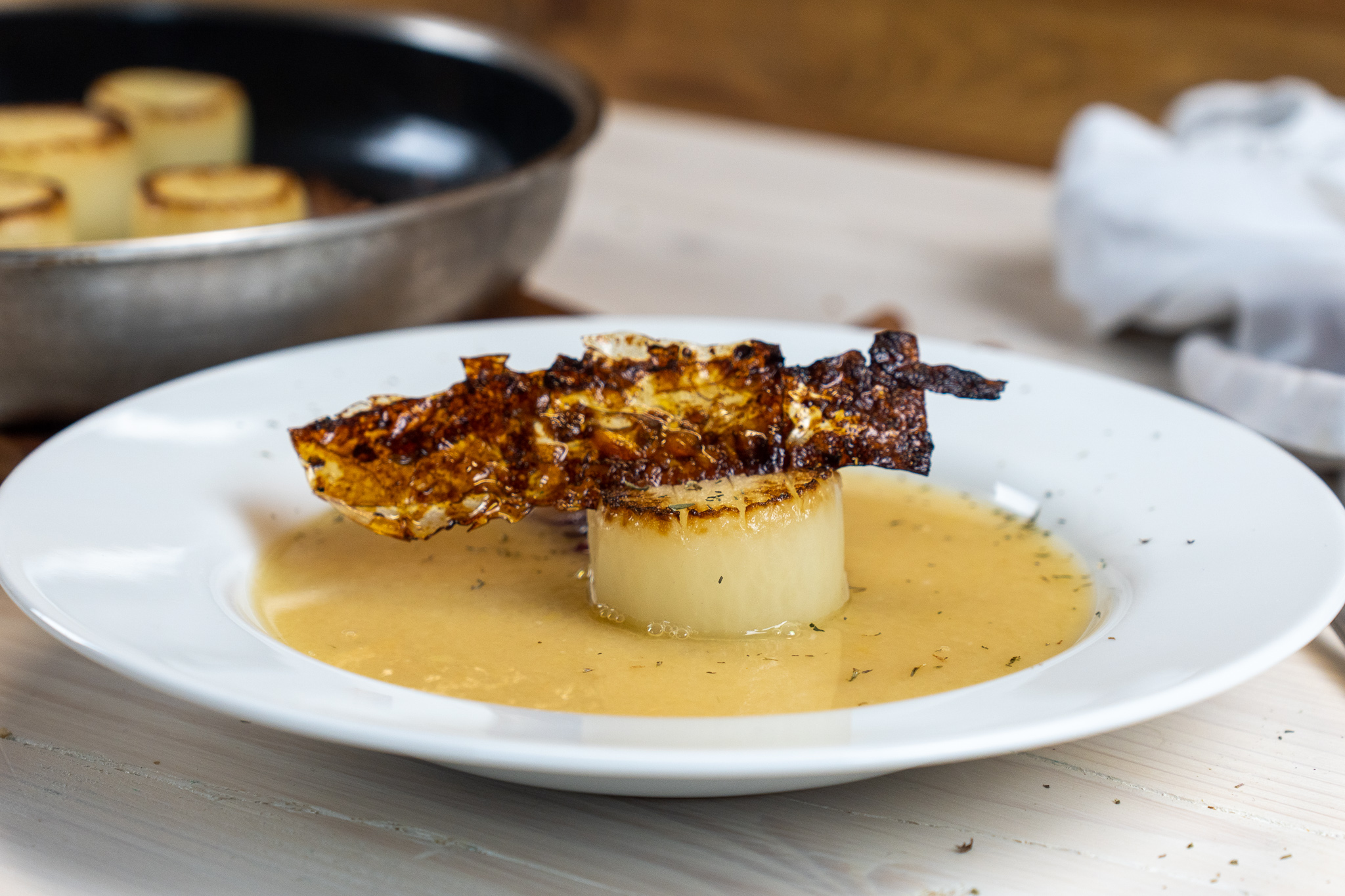 Die Suppe auf Tellern anrichten, eine Jakobsmuschel in die Mitte setzen und mit dem "Speck" toppen. Guten Appetit!